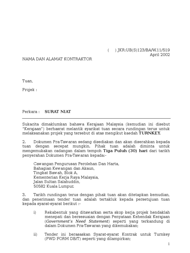 Sukacita dimaklumkan bahawa Kerajaan Malaysia kemudian ini disebut Kerajaan berhasrat melantik syarikat tuan secara rundingan terus untuk melaksanakan projek yang tersebut di atas mengikut kaedah TURNKEY. Surat Mohon Batu Baik Pulih Jalan. Boleh ditafsirkan dalam apa jua cara atau keadaan sebagai mengikat Kerajaan ke atasnya.
